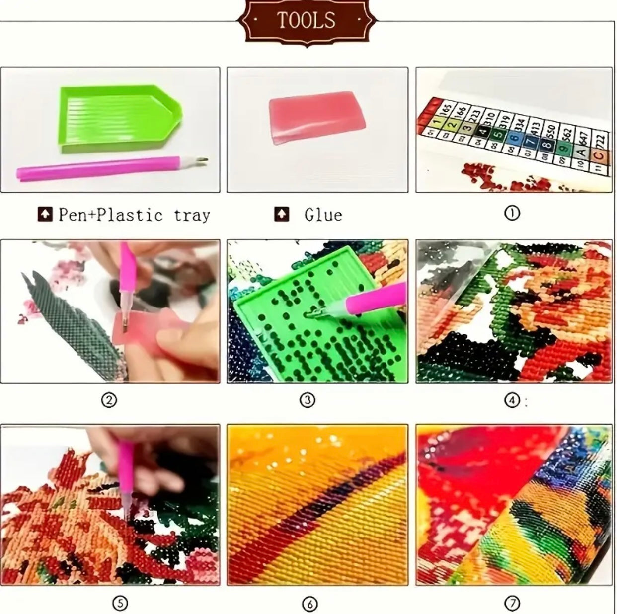 1. Open the package and check the contents. Make sure you have all the necessary items, including the canvas, diamonds, and tool kit. Use the inventory sheet to check the diamond gems. If anything is missing, contact us immediately at support@creativeserenity.co.uk