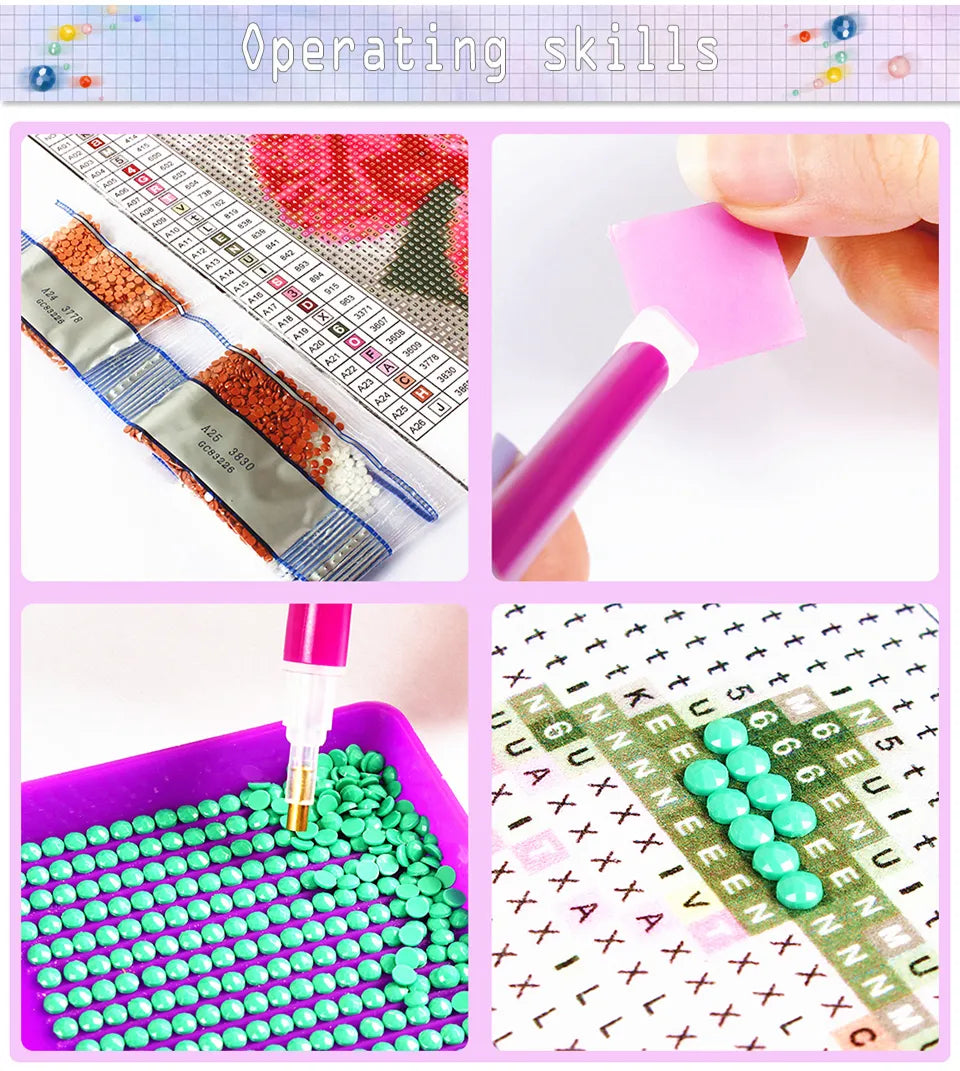 1. Open the package and check the contents. Make sure you have all the necessary items, including the canvas, diamonds, and tool kit. Use the inventory sheet to check the diamond gems. If anything is missing, contact us immediately at support@creativeserenity.co.uk