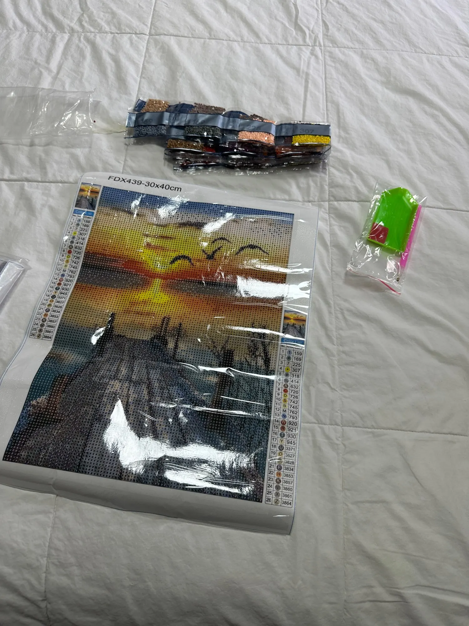 1. Open the package and check the contents. Make sure you have all the necessary items, including the canvas, diamonds, and tool kit. Use the inventory sheet to check the diamond gems. If anything is missing, contact us immediately at support@creativeserenity.co.uk